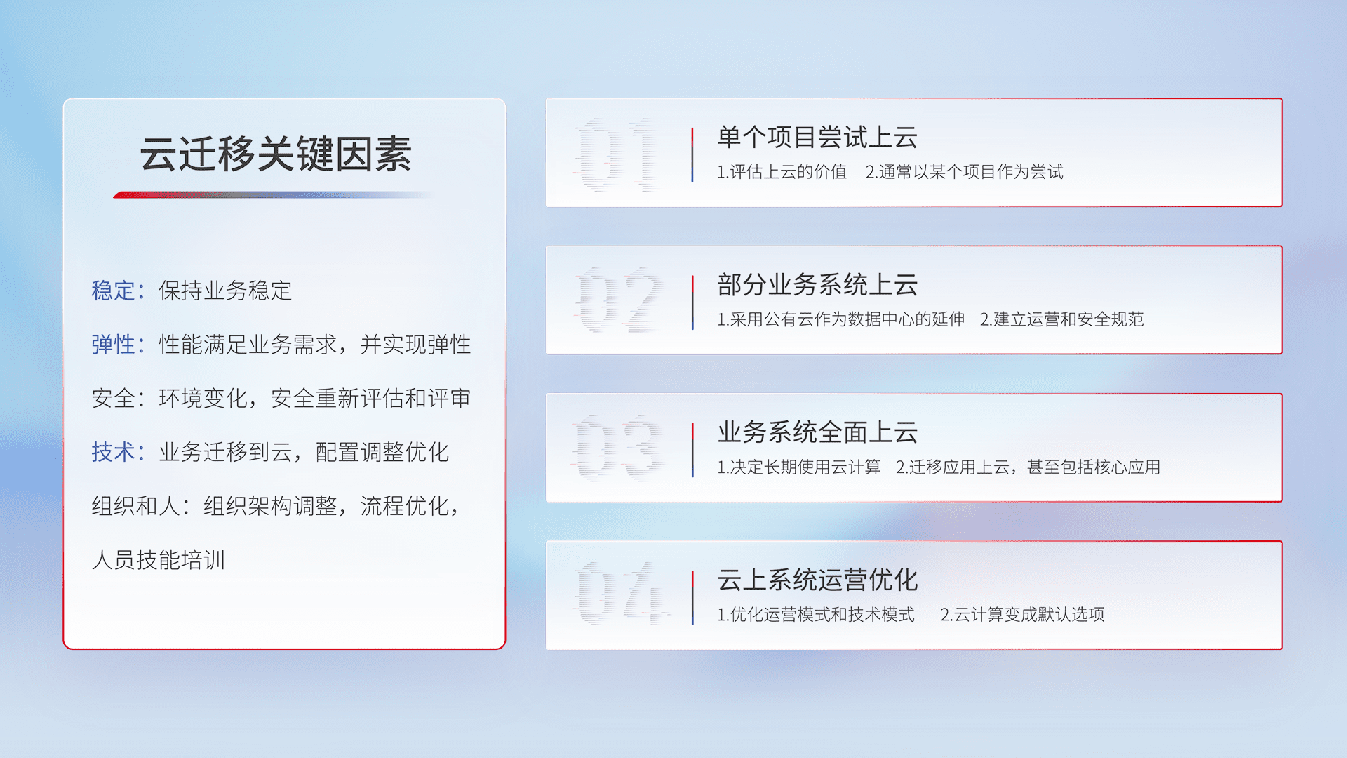 结合实际业务,,从规划设计、、、、云平台选型、、、、云原生改造、、、、数据迁移、、集成交付,,,,迁移全过程为客户识别最佳上云路径,,,,做好风险识别管理,,,设计网络架构、、身份权限、、、安全审计合规、、操作审计、、、、日志审计、、、、监控告警策略、、、、多站点容灾设计等,,,,对云上基础设施进行整体规划,,,提升IT治理水平,,,以满足弹性、、、高可用、、、高性能的需求。。