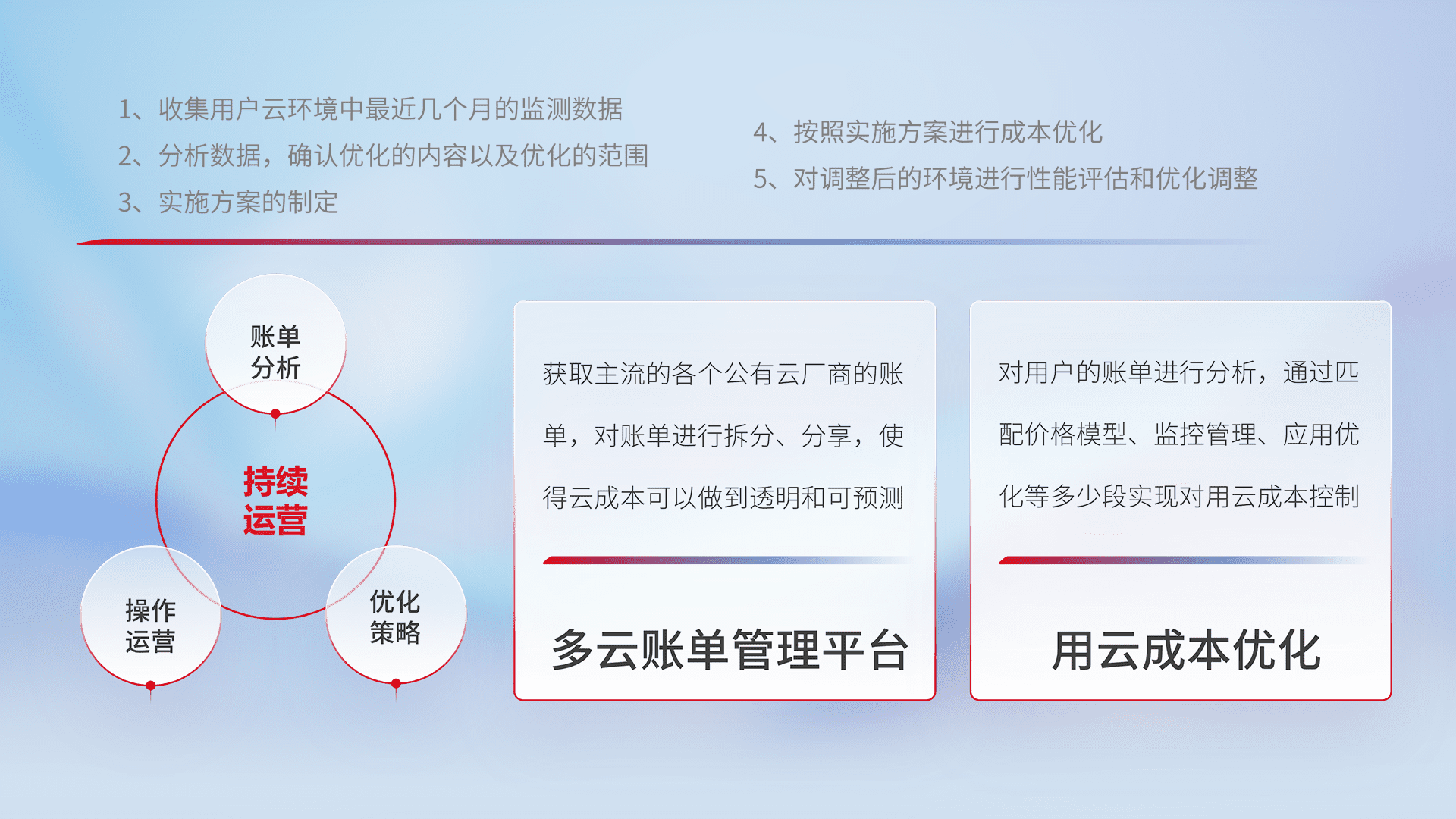 通过多云纳管,,,,以统一的资源数据模型把客户的云资源进行抽象和封装,,,进而实现对多云资源的统一操作,,保障云资源管理的可靠性、、、、稳定性与可用性。。量身定制化运维内容,,配置、、开发运维、、、补丁管理、、、、备份、、监控、、、认证和访问管理、、、、审计和日常巡检等,,保障在用云过程中的可靠度,,,稳定度以及高可用率。。