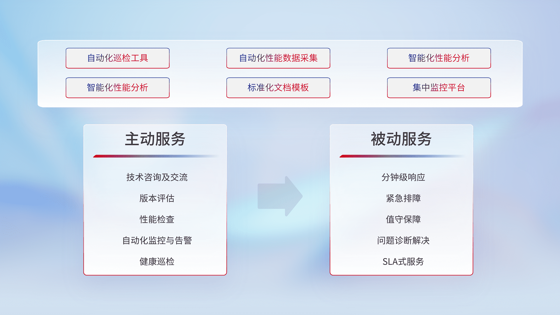 智能化工具和标准化文档,,,保障服务质量,,,,提供主动服务(包含技术咨询、、版本评估、、性能检查、、、、自动化监控与告警、、健康巡检)和被动服务包含(分钟级响应、、、紧急排障、、、、值守保障、、、问题诊断解决、、SLA服务)。。